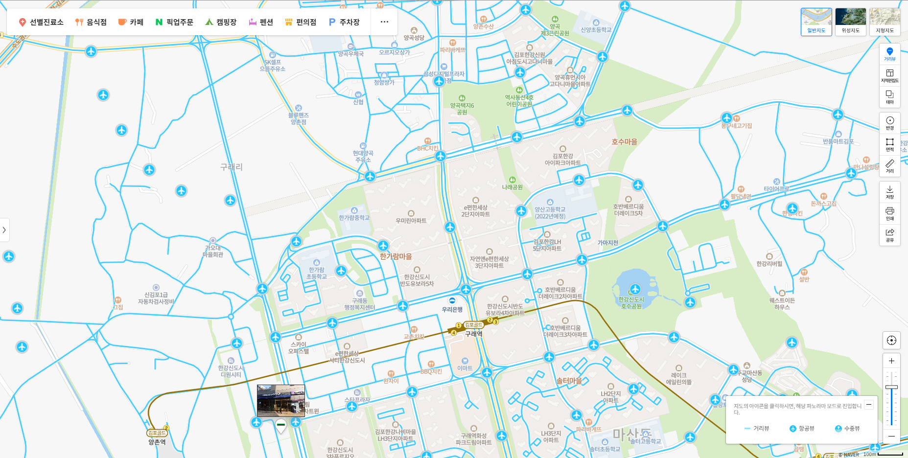 파란 도로들을 클릭하시면 실제 거리뷰를 보실 수 있습니다.
