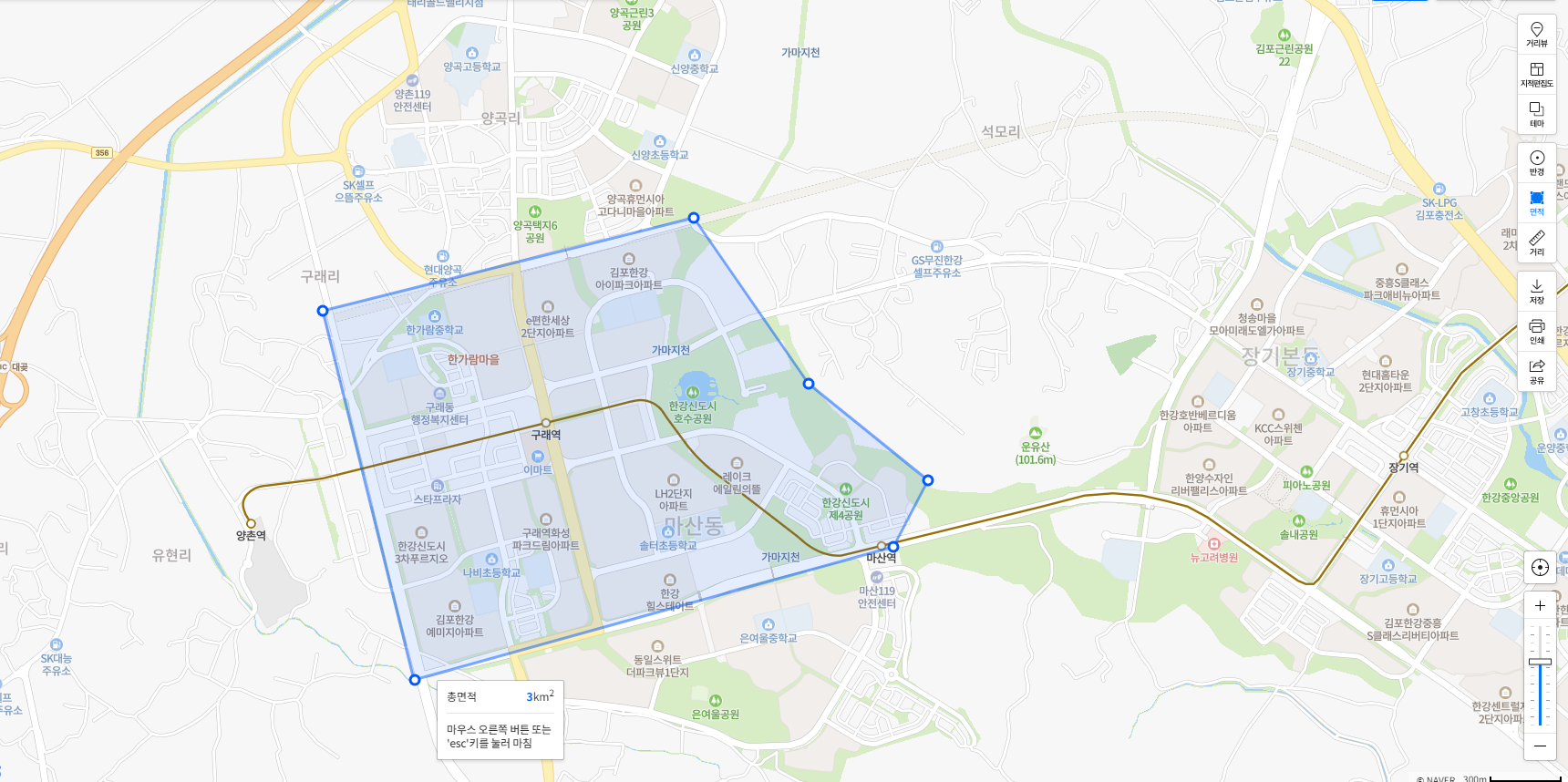 제가 본 지역은 상권 / 공원 / 주거지역이 3km² 에 적당히 포함되어 있기에
